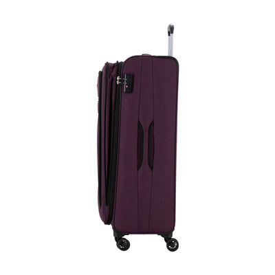 A stylish and functional Samsonite soft-sided spinner suitcase in a deep purple hue, designed for effortless travel with ample storage and secure features.